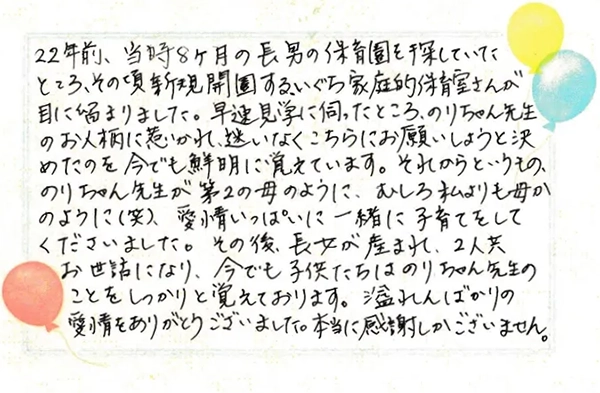 忘れられない思い出は、第2子出産後、近所ですが里帰りしていた時のことです。わが子が退屈MAXの日に「遠足があります!! お迎えに行くから、一緒に行きましょう!」と声をかけて連れて行ってくださり、諦めていた遠足に参加させてもらえたこと。本当に本当に嬉しかったです。